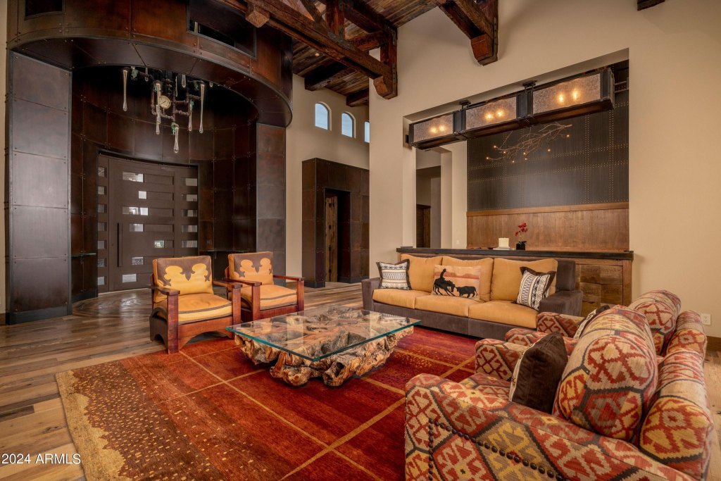 First we’ll step inside the incredible mansion where you are greeted with a vaulted foyer and living room.
