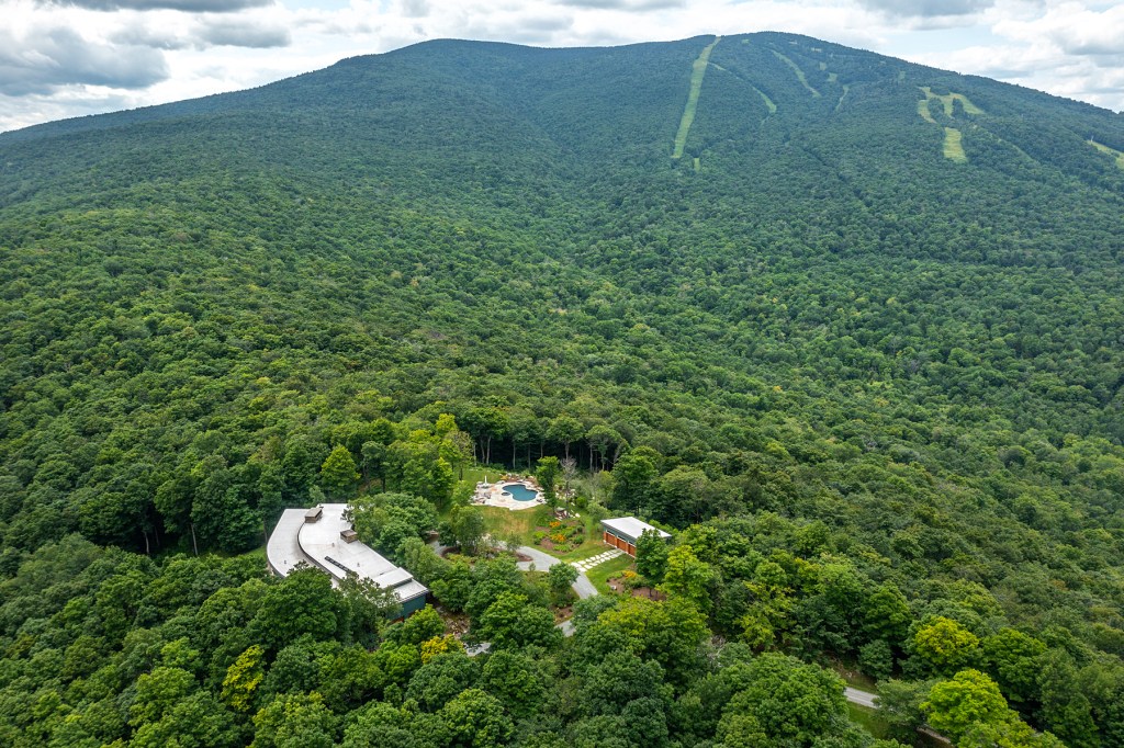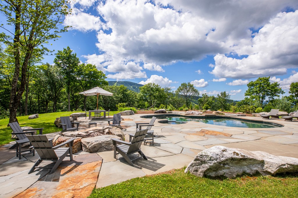 Luxurious 141 acre mountaintop retreat within Stratton Mountain Resort, stunning views of Stratton, Mt Snow, and Bromley. This architectural masterpiece blends comfort and elegance, with multi level interiors harmonizing living areas and en suite bedrooms. Inspired by the graceful arcs of skiing turns, the design features a dramatic entryway leading to a spacious living room and library. An 18-foot stone fireplace and expansive windows flood the space with natural light and breathtaking views. The entry leads to a gourmet kitchen with a large eat-in dining and a formal dining room, perfect for entertaining. The home boasts 6 en suite bedrooms, an expansive primary suite with an office, two custom walk-in closets and a cedar closet. A custom-built bunk room with locker-style cubbies adds playful sophistication. A light-filled hallway connects the upper and lower levels, linking bedrooms, a home theatre, and living areas, enhancing the open and airy feel. Additional amenities include a golf simulator and a movie theatre. Outdoors enjoy mountain views, perennial gardens, natural stone accents, and a bluestone walkways. In warmer months, luxuriate in the gunite pool and hot tub while soaking in views. A gym in the detached three-car garage is perfect for workouts. Tennis and pickleball courts offer additional outdoor activities. This property is a sanctuary where architectural elegance meets mountain tranquility. Discover the epitome of luxury at this stunning mountain retreat.