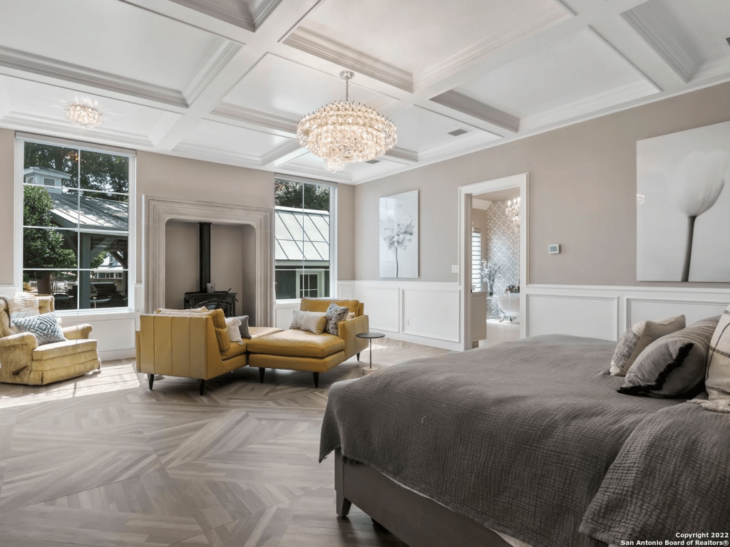 Here’s the primary bedroom. Love the coffered ceiling and how cozy that fireplace looks!