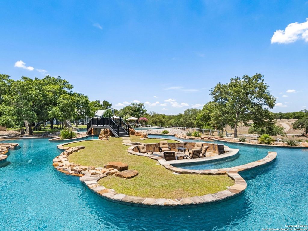 Can you guess why this over 72+ acre Boerne, TX home is called the โLazy River Ranchโ ? Currently listed for only $4,850,000. Per the listing the property has a 3 bed, 5 ba main house with 5,026 ft with multiple offices, living rooms, and more. It also includes a fully renovated 3 bd, 2 ba 1,800ยฑ sqft Guest House that overlooks a canyon with year-round live water springs. And a custom-built 1,400ยฑ sqft 1 bd, 1 ba pool house. The house overlooks a custom Keith Zars designed and built Junior Olympic swimming pool and a Keith Zars resort-style lazy river with a swim-up bar and fire pit. The estate also includes a golf driving range, multi-deck shooting range, sports court, and multiple additional buildings and barns.