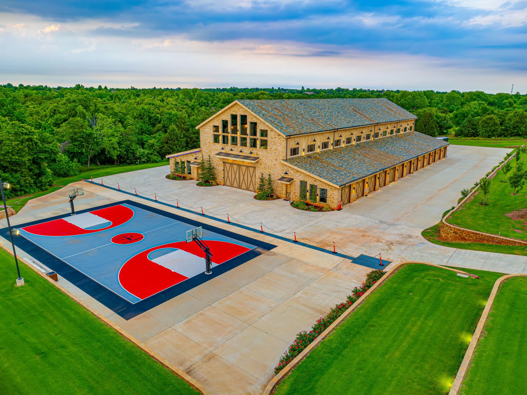 An additional $6 million 32,000 sq ft heated and cooled barn with an indoor basketball court, outdoor basketball court, multiple bars, dance floor, performance stage, 33 oversized car garages and 2 oversized his/hers bedroom suites.