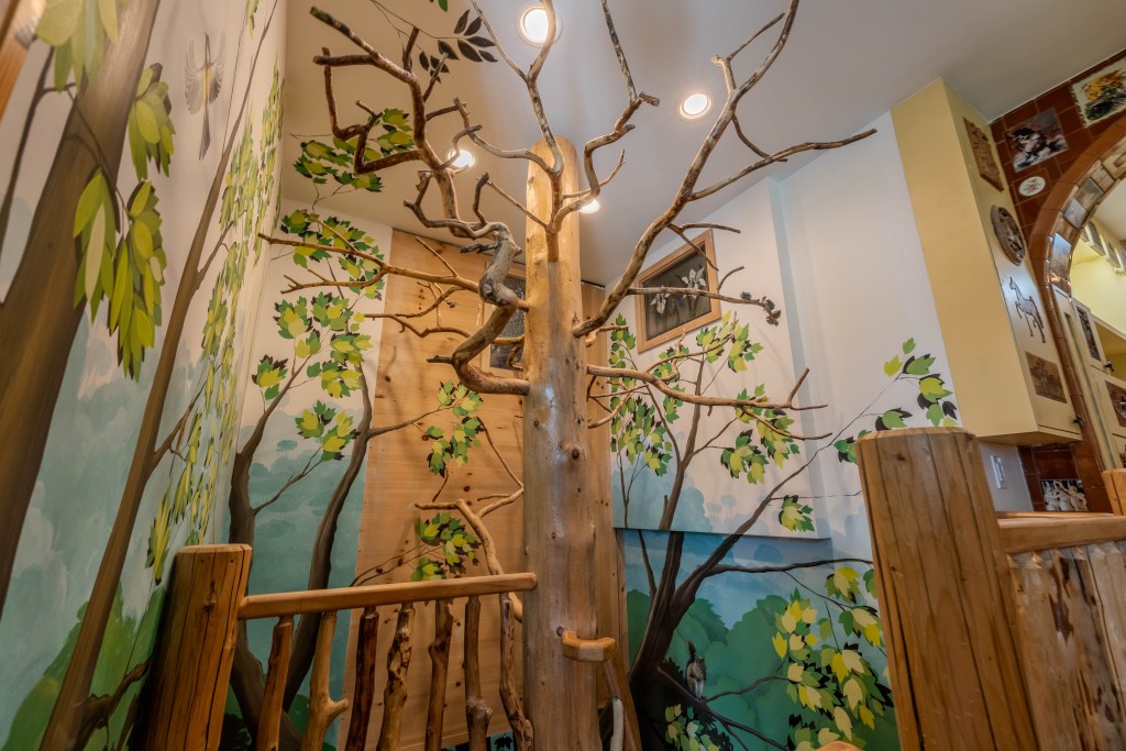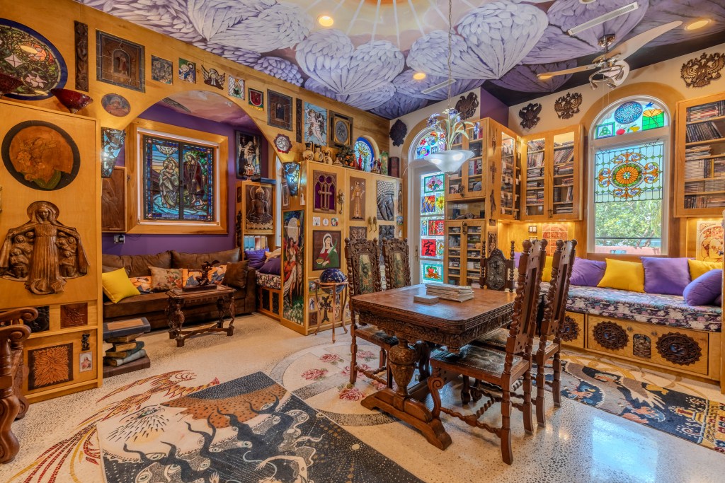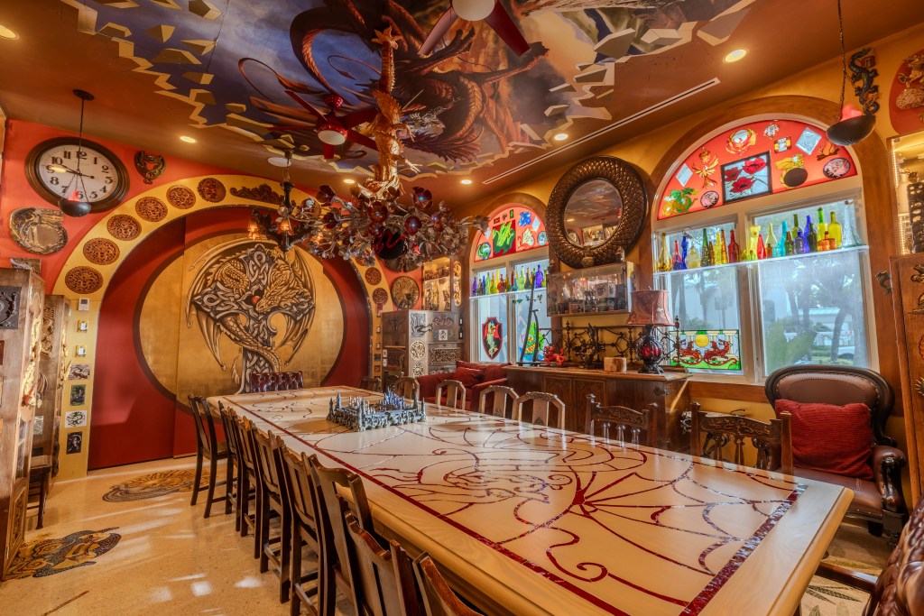 Right off the foyer is the dining room AKA the Dragon Room! Everything is handcarved and the ceilings are all hand painted – this one has the homeowner riding the dragon!