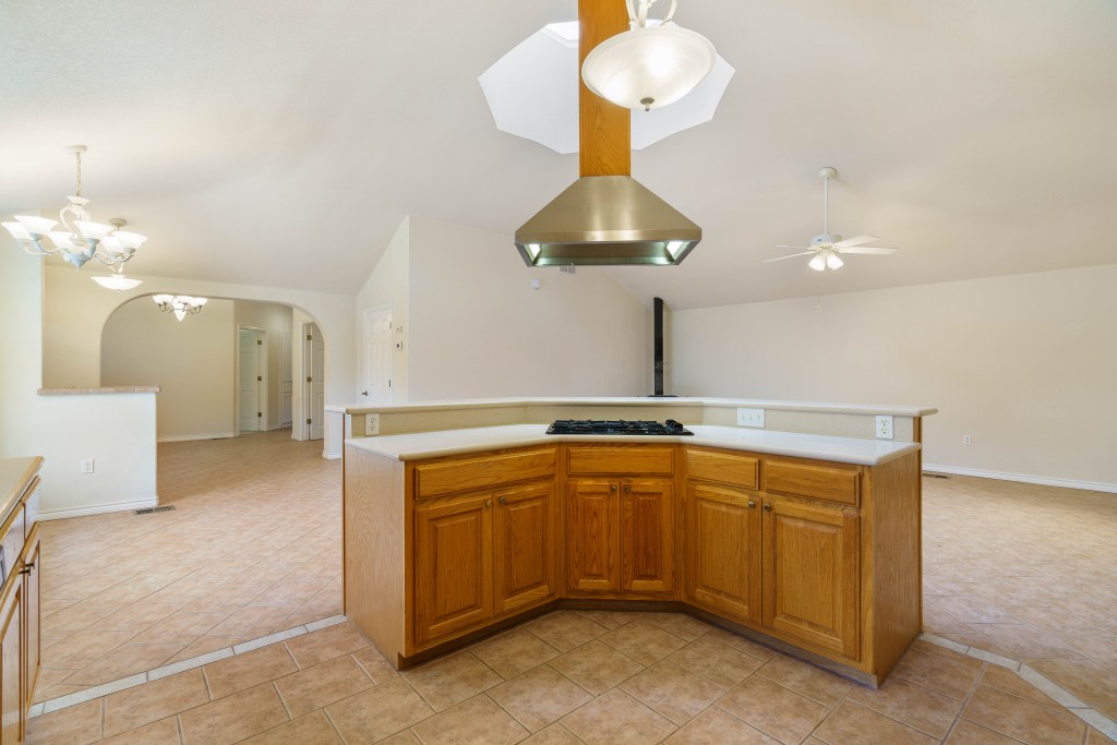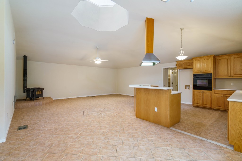 Step inside and it has an open concept and wood burning stove! That’s great if you have wood to burn!