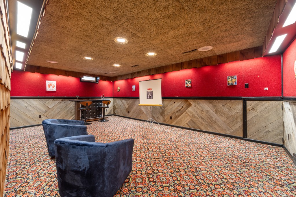 As you can see it the mcm is in pristine condition. How do you even vacuum that ceiling? Does Dyson make a ceiling vacuum? I hope so. to top it all off that projector screen is so cute!!