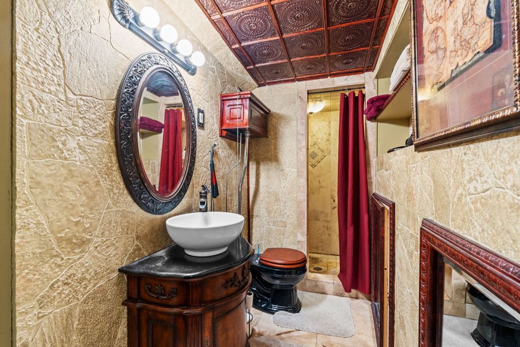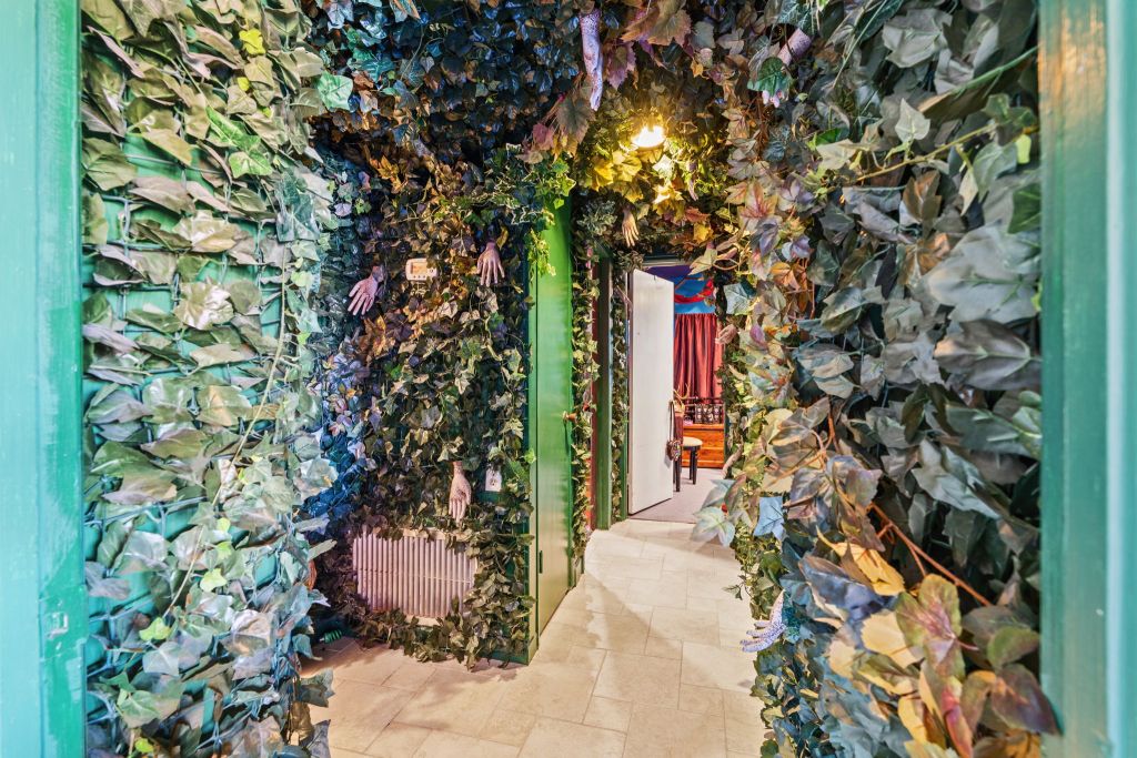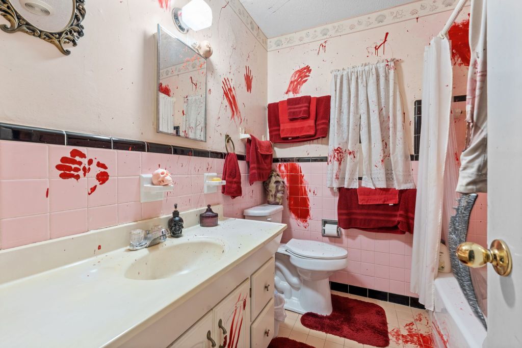 The bathroom design with blood hand print walls is honestly one of the most creative bathroom designs we’ve ever seen.