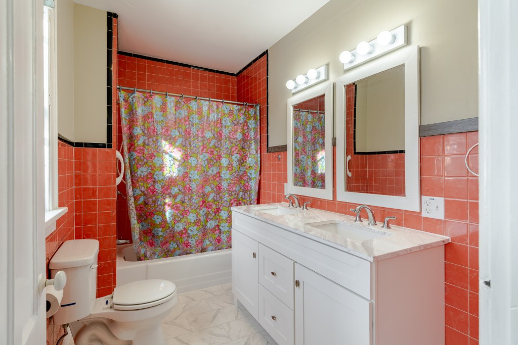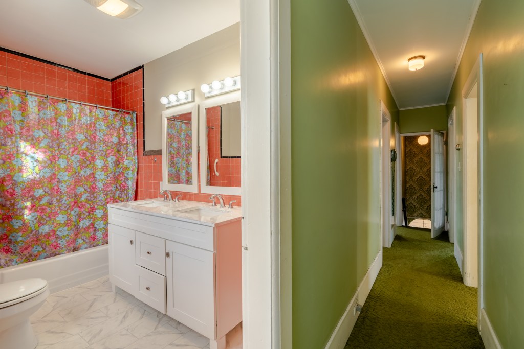 This bathroom is so cute! My kingdom for a pink-tiled bathroom.