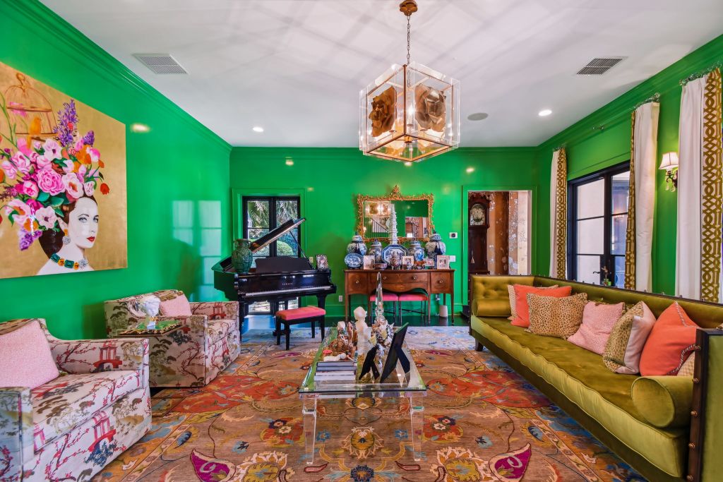 Here’s another living room with a green lacquer. I’m a sucker for a good lacquer. What song are we playing on that grand piano?