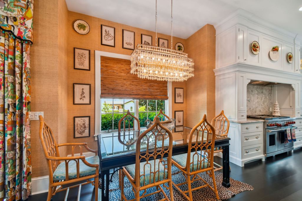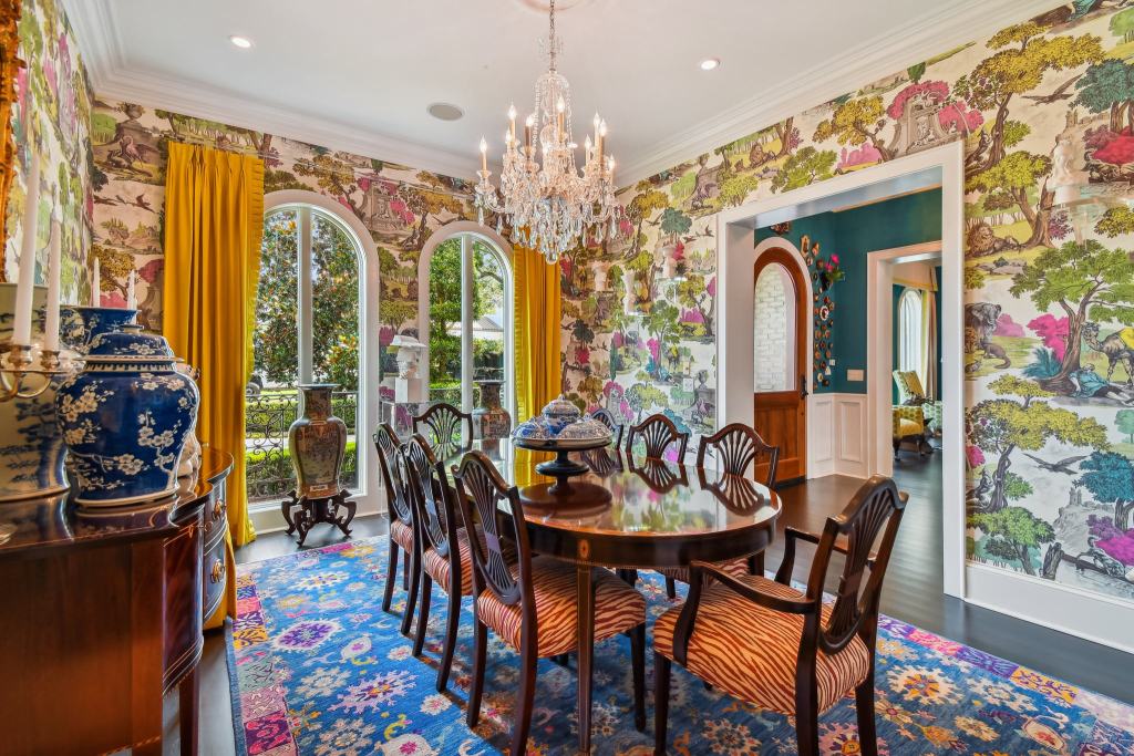 The dining room is also clad in pretty wallpaper!