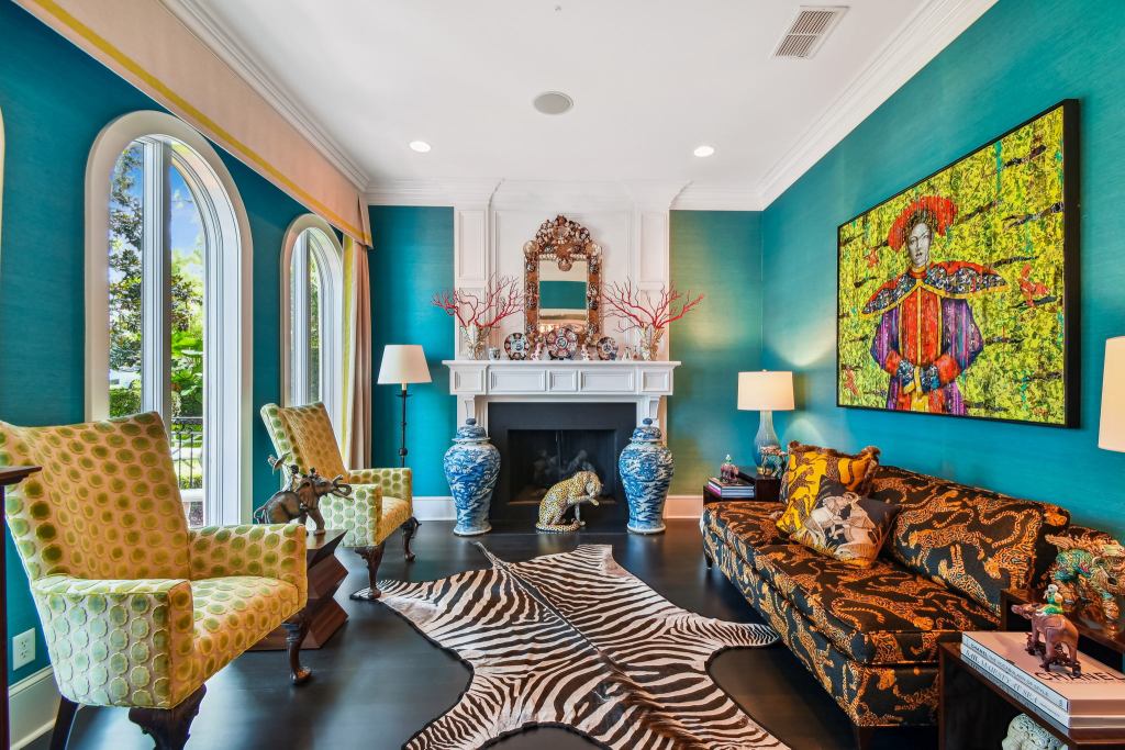 The wallpaper continues to the formal living room! No maximalist home is complete without a zebra rug.
