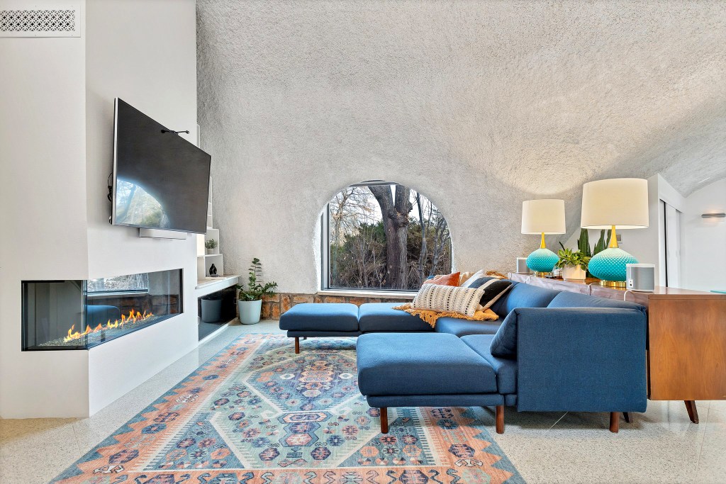Step inside and it feels very midcentury modern, although it was built in 1982 per the listing. I love that rock wall and curved staircase. I love the terrazzo tile floors and I believe they are also heated!