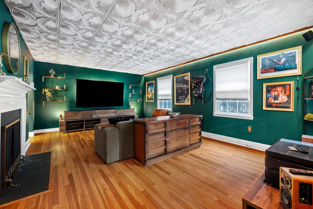 The living room/family room is painted a beautiful green and has a gorgeous ceiling. This feels like maximalist to the max! There is tons of natural light and what is that ceiling made out of? I hope it’s tin.