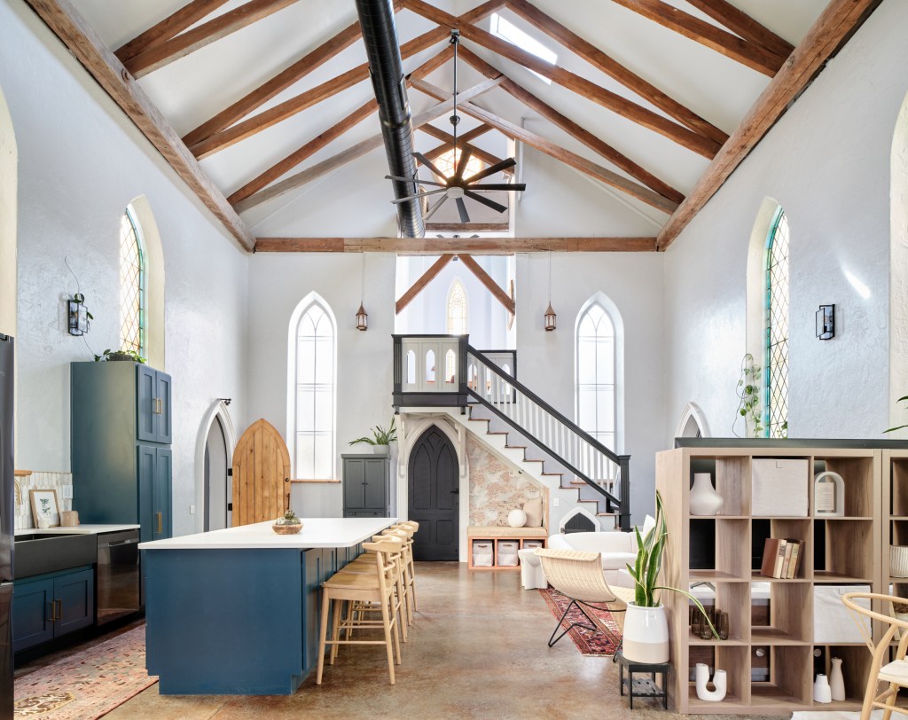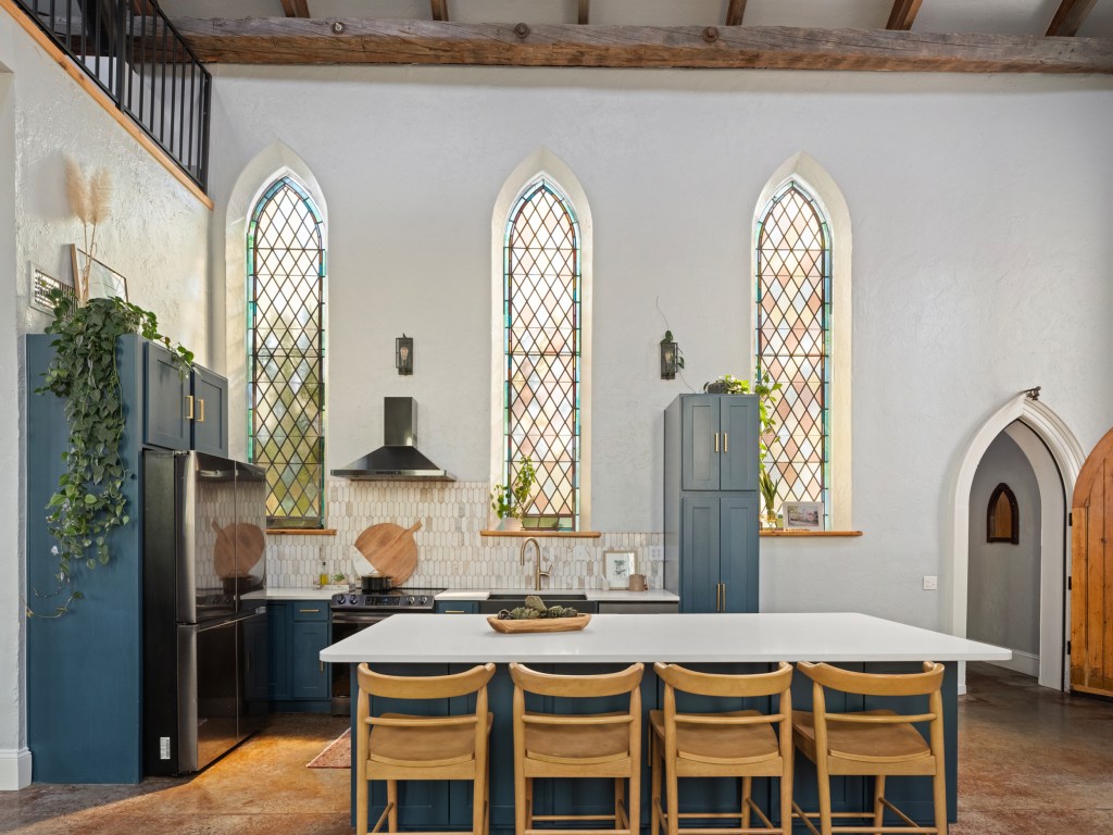 Step inside the former church and you can see how grand and vaulted the interior is. Not too big but pretty enough to have a kitchen, living space and dining room!